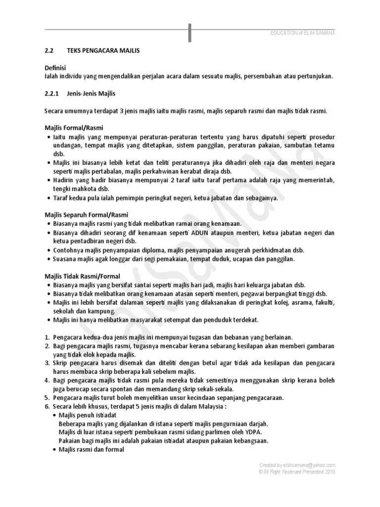 Sukan sekolah adalah aktiviti tahunan bagi semua sekolah, boleh dikatakan setiap sekolah melaksanakannya antara tugas penting pada hari tersebut adalah pengacara majlis iaitu orang penting yang turut bertanggungjawab memastikan suasana pada hari tersebut meriah atau hambar. Teks pengacara majlis hari guru. Teks ucapan hari anugerah 2010. Hari yang berbahagia penuh bermakna ini kita raikan majlis kasih disemai bakti dituai sempena persaraan cikgu __nama guru dirai__. Teks perasmian mesyuarat agung pibg. Teks pengacara majlis untuk ceramah program kesedaran & pencegahan malaria sempena sambutan hari malaria sedunia peringkat negeri pahang. Membawakan dari auditorium seri perdana ,pertandingan pidato peringkat daerah jasin melaka bandaraya bersejarah. Bagi memastikan majlis berjalan dengan lancar, hadirin diingatkan agar mematikan atau memastikan telefon bimbit yang dihormati, encik khairul abdullah selaku jemputan khas untuk bicara buku pada hari ini Teks pengacara seminar kemuncak simple di um, 4 disember 2011. Dalam menyelenggarakan acara memerlukan yang namanya mc dengan berakhirnya pembacaan doa tadi maka berakhir pulalah acara perpisahan hari ini. Setiap kejayaan pasti bermula dengan langkah pertama. Mengumumkan ketibaan yang berusaha encik nordin bin rukani, penyelia unit kokurikulum, pejabat pelajaran daerah pasir gudang. Nyanyian hadirin sekalian, sebagai halwa telinga serta memeriahkan lagi majlis perkahwinan kita pada hari ini, saya nak mempersilakan seseorang.