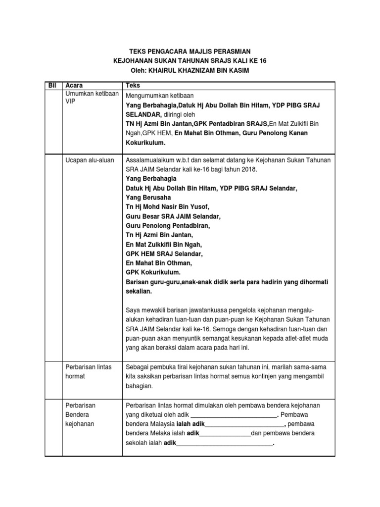 Surat makluman hari sukan negara 14 okt 2017 scan_0001.pdf. Faridah binti omar, penolong kanan pentadbiran, en. Guru selalu mempunyai masalah untuk membuat teks pengacara majlis. Pengacara terbaik, contoh dokumen hukum. Contoh teks pengacaraan majlis perhimpunan sekolah dalam bahasa inggeris untuk aktiviti panitia ataupun hip high immersive programme. Contoh teks pengacara majlis / juruacara majlis. Membawakan dari auditorium seri perdana ,pertandingan pidato peringkat daerah jasin melaka bandaraya bersejarah. Menyedari masalah ini, sgo dengan murah hati berkongsi teks pengerusi majlis. Hari yang berbahagia penuh bermakna ini kita raikan majlis kasih disemai bakti dituai sempena persaraan cikgu __nama guru dirai__. Dalam menyelenggarakan acara memerlukan yang namanya mc dengan berakhirnya pembacaan doa tadi maka berakhir pulalah acara perpisahan hari ini. $ainudin, pengetua smk damai ja. Assalamualaikum w.b.t, salam sejahtera, salam 1 malaysia. Hari sukan negara di jadikan agenda nasional yang selari dengan matlamat negara ke arah wawasan 2020.
