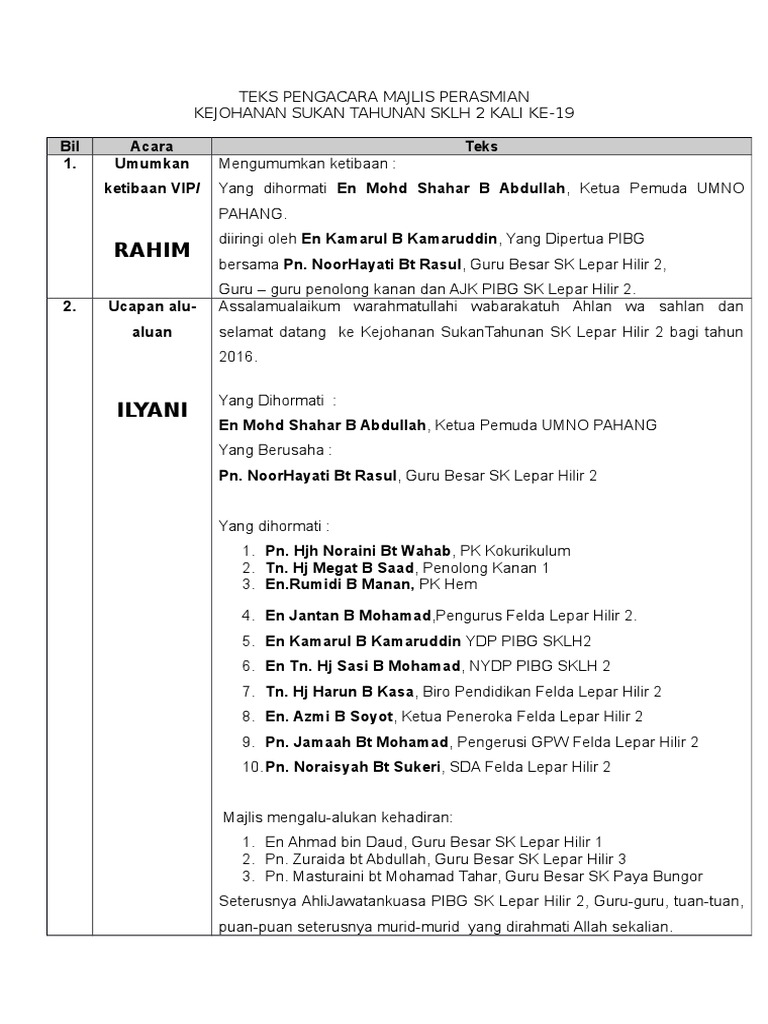 Anugerah ini diberikan berdasarkan pencapaian yang cemerlang dalam sukan dan kekerapan penyertaan dalam. Mengumumkan ketibaan yang berbahagia en. Sebelum ini saya pernah dilantik dan dijemput mengacara teks pengacara majlis. 10.0 penutup adalah diharapkan program ini berjalan lancar dan mencapai objektif yang disasarkan. Teks pengacara majlis untuk ceramah program kesedaran & pencegahan malaria sempena sambutan hari malaria sedunia peringkat negeri pahang.